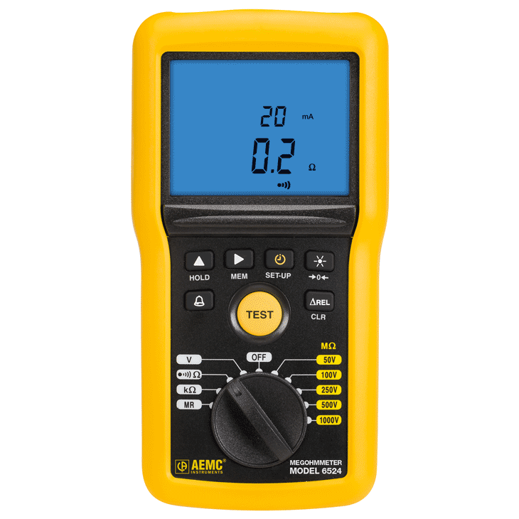 The Megohmmeter Model 6524 is a handheld, battery powered, multi-function 1000V digital insulation resistance tester with onboard memory. It is designed to measure Insulation Resistance, Continuity, Resistance, Frequency and Voltage. With a safety rating of 600V CAT IV and IP 54, the Model 6524 performs insulation resistance at 50, 100, 250, 500 and 1000V measuring insulation values up to 200GΩ. Meter also incorporates a 700V AC & DC True RMS voltmeter and continuity testing with a selectable 20mA or 200mA test current. PI, DAR and Alarms function are standard. The Model 6524 includes a Timer and Lock function which allows the user to operate the unit hands free. Automatic safety check protects user and meter with audiovisual signals and test inhibition when >25V is present on test sample. Large digital/analog multi-function display provides clear and easy readings enhanced by a bright blue electroluminescent backlight. A magnetic stand holds the meter to a metal surface or cabinet during the test. Optional Remote Test Probe accessory with flashlight simplifies repetitive testing and helps access hard-to-reach, poorly lit, test areas. With the possibility to save up to 300 tests in memory, the Model 6524 is a great tool for most of the insulation tests in the shop or in the field where a wide range of voltages, up to 1000V, are desired.