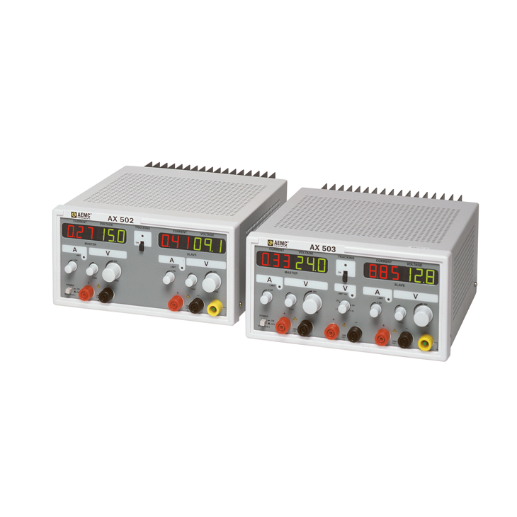 The AEMC AX503 DC Power Supply offers dual 30V outputs with the ability to display both voltage and current for each output. Additionally, the AEMC AX503 DC Power Supply offers a 5V blind output which is adjustable from 2.7 to 5.5V. Dual 30V outputs can be connected in series to provide double the output voltage up to 60V, or they can be connected in parallel providing double the current output up to 5A. The AEMC AX503 DC Power Supply offers a unique master/slave tracking arrangement whereby the ratio between master and slave can be setup on the fly as needed during the test. Adjusting the master voltage causes the slave to track. Adjusting the slave voltage causes the ratio from master to slave to change accordingly. It offers a Coarse and Fine voltage adjustment as well as current limiting adjustment. The Model AX503 is built to provide many years of reliable, precise, easy-to-use operation and will be a welcome addition to any lab, test bench or production line.