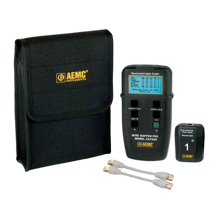 The AEMC Cable Tester – CA7028 Wire Mapper Pro (LAN Cable Tester) is a hand-held structured cable mapping and troubleshooting tester designed for use on UTP, STP, FTPand SSTP cabling equipped with RJ-45 connectors and wired to either TIA568A/B (ISO11801 and EN 50137), USOC or ISDN specifications. It detects open circuit pairs, shorts, crossed wires, crossed pairs, reversed pairs, split pairs and shield faults.