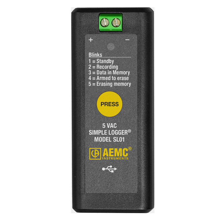 AEMC’s Simple Logger® Data Loggers are small one channel recording devices powered by two AA alkaline batteries or through the USB port. These AC and DC loggers can be ready to go in minutes with just a few parameters to set up. Models are available for logging AC voltage, DC voltage, DC current, temperature, pulse and events. Application software is included with the unit by plugging it into your computer using the USB cable and downloading it from our web site. Scaling units of measure and recording length can be set through the software. Real-time graphs can be displayed, downloaded data can be analyzed, and reports printed. The main advantage of the logger is its ability to begin recording with only the need to configure a few parameters. A simple one button operation is all you need. The front panel LED alerts the operator of the logger’s status.