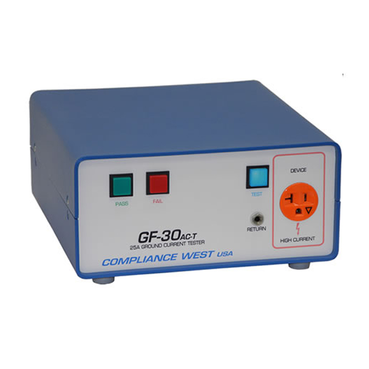 25A Ground Bond Tester for TUV and other Production LIne Tests.  Simple to use, easy to interpret: GREEN is PASS, RED is FAIL; FAIL stops test and buzzes.  A complete, one-touch solution when teamed with a Compliance West Hipot Tester and our HTT-1R Function Tester.  Ships complete with test cables and a NIST Calibration Certificate.  Heavy metal case and rugged construction, designed for factory environments and continuous product testing.  A quality product built to last, made in the USA.