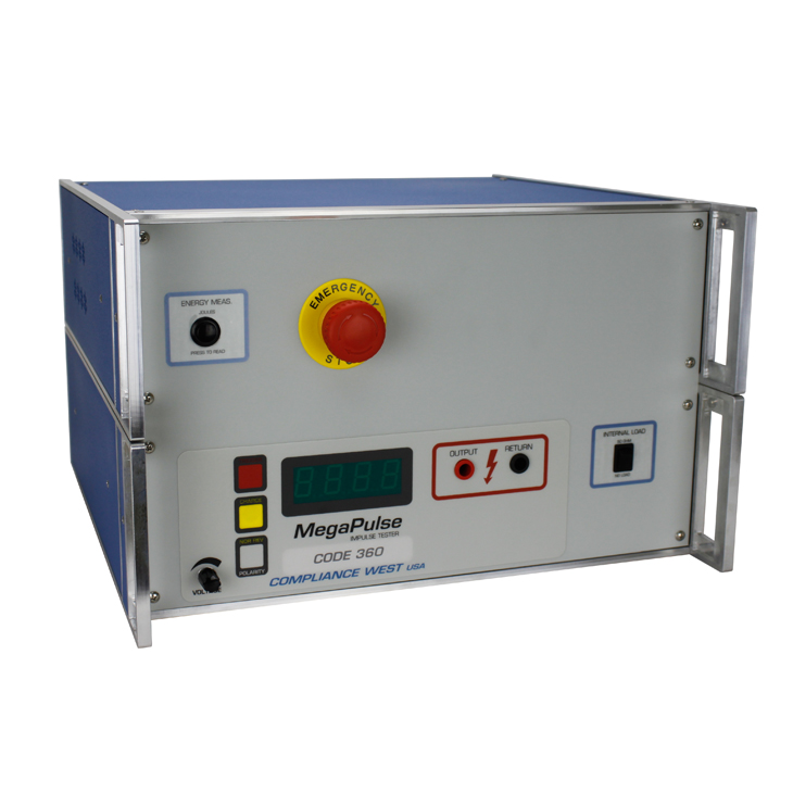 A Compliance West surge tester that delivers 360J of energy in a damped sinusoidal (Lown) waveform with a load of 50Ω connected to the output. Mimics the output of a well-known defibrillator tester that is the de facto standard used for the medical industry to describe a full defibrillator pulse.