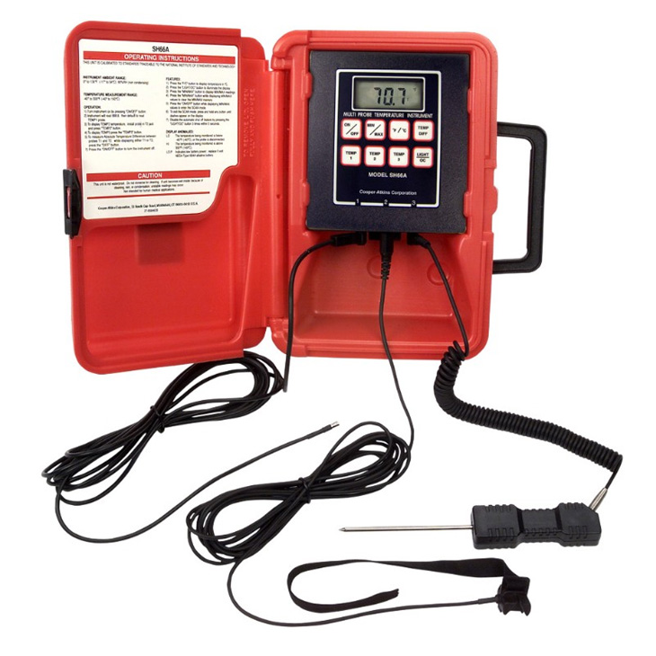 The SH66A-E Multi-Temperature Thermistor is the perfect choice for applications when multiple temperature measurements are needed. Features include: LCD backlight for dark environments; sealed keypad which protects the instrument from spills and dust; and a battery eliminator jack. It simultaneously measures suction and liquid line temperatures, temperatures across condensing coils, evaporator coils and ambient temperatures. View temperature differential between zones 1 and 2 and review min/max temperatures from all three zones. The SH66A-E-032 includes the #1075 general purpose probe, #2010 Air Probe and #4011 pipe strap probe. Certificate of Calibration & Report included.