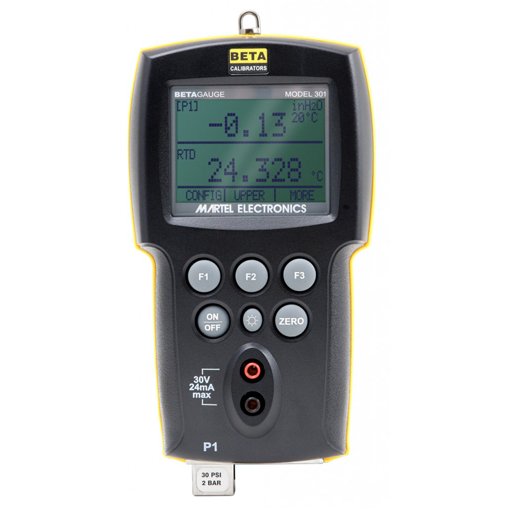 The 301 is a single pressure calibrator offering great performance at ±0.05% accuracy. It combines pressure with milliAmp and Voltage measurement capabilities, as well as built-in loop power supply to power transmitters under test. With an optional BPPA-100 adapter, the 301 can even use industry standard BetaPort-P high performance pressure modules. A large backlit display can be configured to show one, two or three variables. Another advanced feature not normally seen in this price range is the ability to easily perform switch tests. The calibrator automatically captures and displays set and reset values. Pressure readings can be displayed in a number of engineering units including PSI, inches of water (with selectable temperature compensation), Bar, mBar, cmH2O, kPa, and other including a user defined option. Other features include remote operation via RS-232 serial port; power from 4 AA alkaline batteries, standard carrying case and test leads. A range of pressure pumps and pump kits are also available for a full pressure calibration package. The BetaGauge 301 is supplied with carrying case, test leads, instruction manual, set of four AA alkaline batteries, and NIST certificate with data. Kits include the BetaGauge 301 Pressure Calibrator, carrying case, pneumatic pump, connections and fittings.