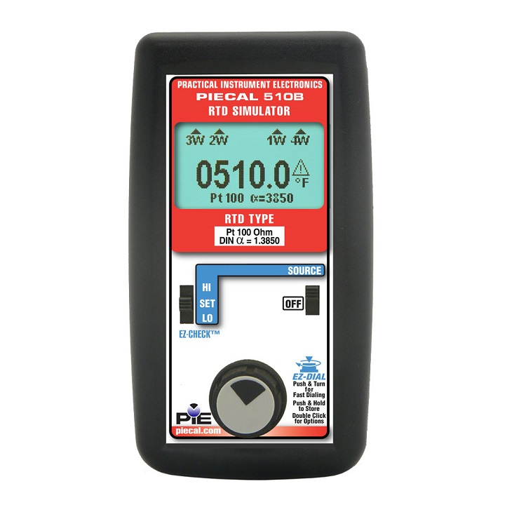 The PIE Model 510B simulates RTD resistances into all types of process instruments including transmitters, recorders, controllers, alarms, data acquisition, and computer systems. No longer will you need to need to lug a decade box around or make errors reading RTD tables incorrectly. The PIE 510B is a superior replacement for decade boxes while eliminating errors caused by misreading RTD to resistance tables by allowing you to dial directly in temperature. The PIE 510B has better accuracy than many higher priced RTD calibrators.
