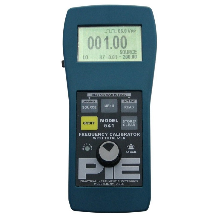 The PIE 541 Frequency Calibrator is designed for calibration, testing, and diagnosing turbine meters, frequency counters, vibration systems, tachometers, vortex shedders, integrators, and any other frequency devices in the shop, plant or field. Save hours of time compared to other calibration methods. When calibrating a totalizer, the Model 541 eliminates the need of a stop watch. Set the number of pulses and number of minutes required and it automatically stops when the selected number of pulses has been sent to the totalizer! The PIE 541 has a handy LED indicator showing gate time for easy trigger level adjustment. The LED also pulses with the frequency output for calibration of optical pickups.