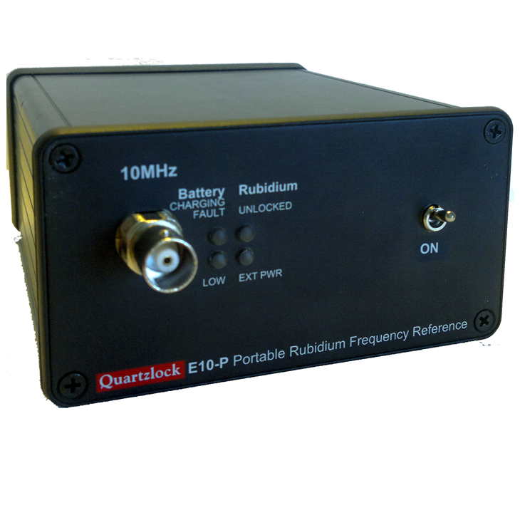 Recharging / operating from internal 12Vdc, this miniature enclosure, only 103 x 55 x 122mm has all the performance needed for on-site calibrations, referencing and portable transfer standard applications. Quartzlock’s SMAC (sub miniature atomic clock) technology far outperforms chip scale atomic clock devices with poor AVAR & phase noise.The E10-P benefits from simple operation just connect output BNC connector to device under reference.Operation to warm (3min) from 12V car supply, in transit to on-site application, saves the higher power warm stage.The E10-P is hand held, with <500g mass, and is one of the smallest & lightest atomic clocks with -95dBc/Hz Phase Noise and 8 x 10-12/100s Stability. (100 x better than any OCXO).The power consumption is 6W at 12V dc / 500mA after 3min warm time.No antenna is required or view of sky as the E10-P is a completely independent atomic reference.