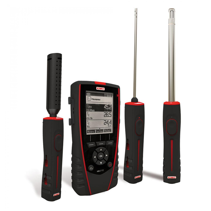 Multi-probe portable thermo-hygrometer-air quality. With backlit graphic display, 2 input channels for measuring probe and PT100 temperature probe (-200 to +600C), output for PC and printer.