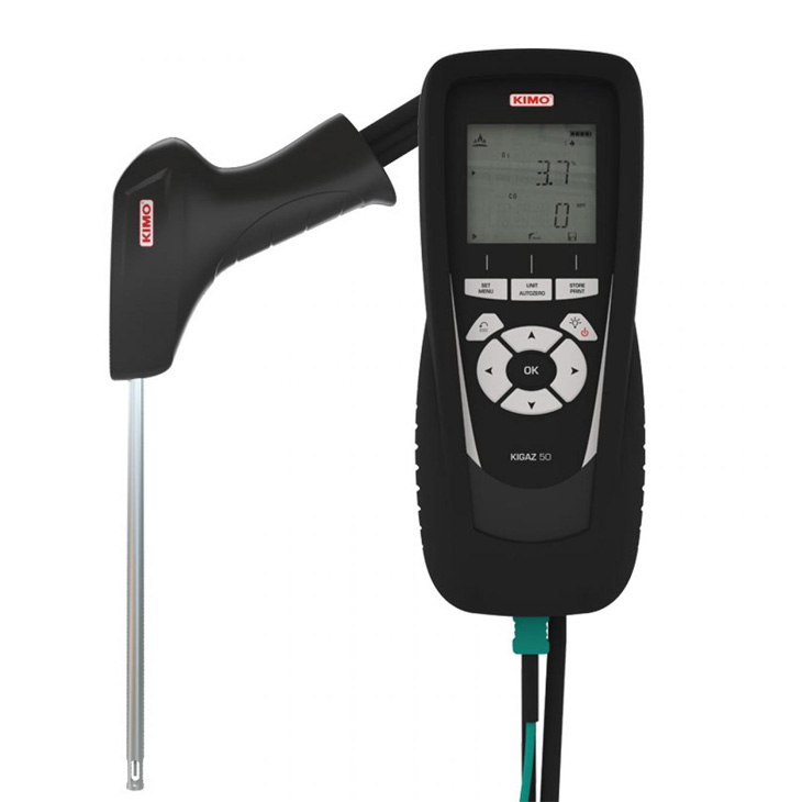 Combustion gas analyser Type KIGAZ 50 for any type of boilers with 2 cells: O2 and CO. Autozero 30 seconds, 10 hours autonomy, magnetic housing. Supplied with transport bag, 180 mm probe with integrated draft measurement, Li-Ion battery, USB charger, USB cable and adjustment certificate