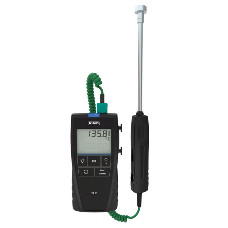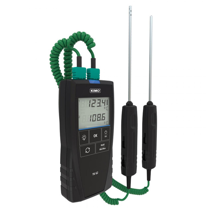 Thermocouple K, J, T, S, 1 or 2-channel (TK 61 / TK 62) portable thermometer (-200 to + 1760°C), 2-line display. Functions: Hold, Min, Max, backlit display, alarm, change of unit, configurable auto switch-off and selection of thermocouple type. Supplied with batteries and adjustment certificate.