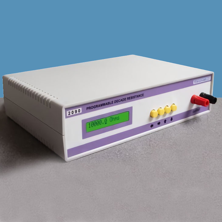 Connect the 2090 via RS232 connection (USB to RS232 adapter available) to a computer to automate any task performed by a decade resistance box, to automate calibration or ATE tasks. Providing a basic accuracy of up to 0.1% (0.01% accuracy option available), the 2090 is ideal for simulation of any resistance from 0.1 Ohm to 99.9999 kOhm. Control of the 2090 uses simple commands that can be sent to the unit from any program or programming language, or using the included 2090 Virtual Front Panel software. The 2090 provides passive resistance output, and exactly mimics the performance of traditional decade boxes. For use without a computer, the 2090 provides control via keys on the front panel, and a display to indicate the current output.